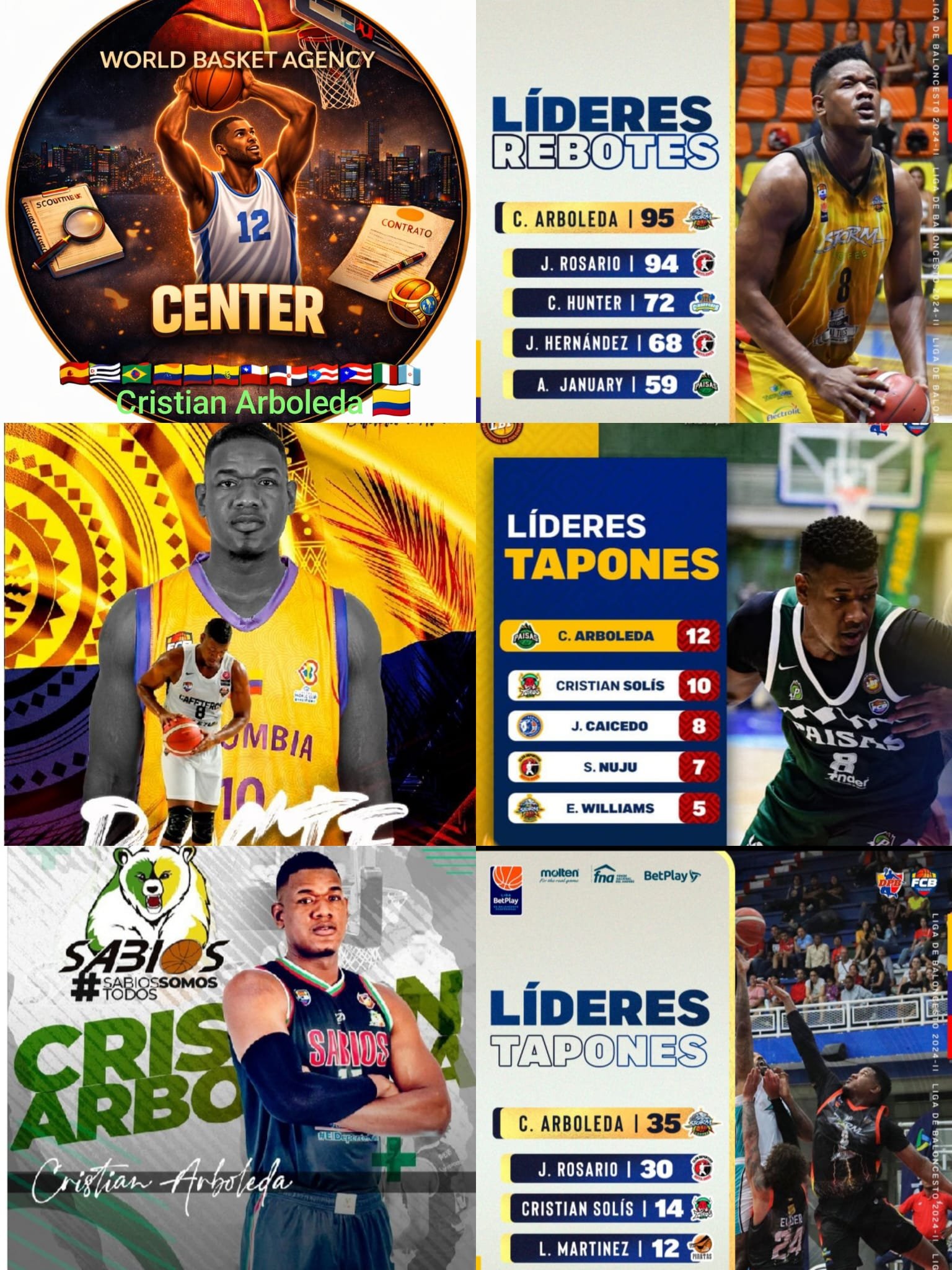 Cristian Arboleda es un pívot colombiano nacido en 1992, con una estatura de 2,05 m, que ha desarrollado una trayectoria marcada por su presencia en la pintura y su capacidad para aportar rebotes y defensa. Formado en Colombia, ha jugado en la Liga WPlay con Bucaros de Bucaramanga y más recientemente con Los Paisas de Medellín, siendo parte de la Basketball Champions League Américas.